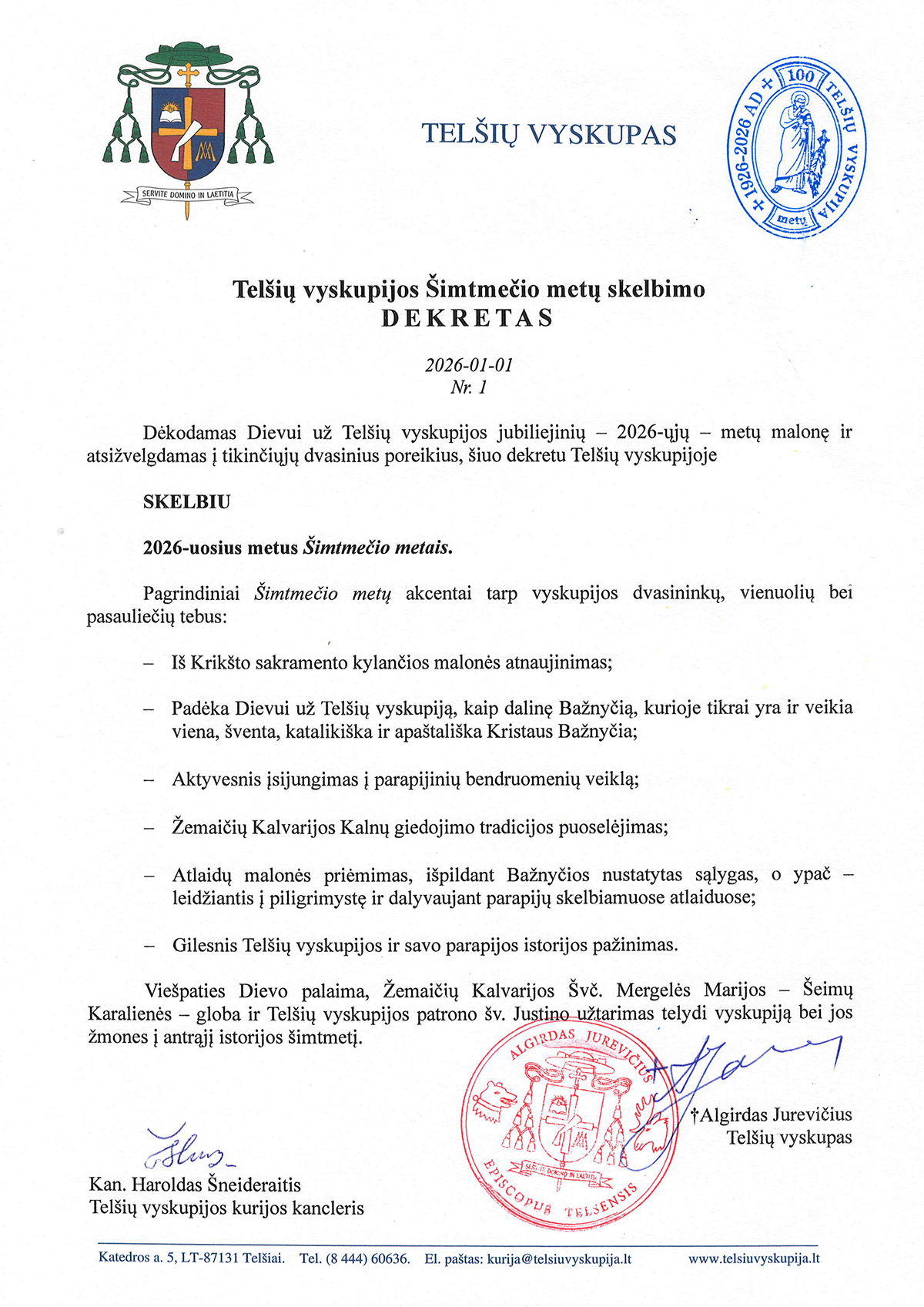 „Dėkodamas Dievui už Telšių vyskupijos jubiliejinių - 2026-ųjų - metų malonę ir atsižvelgdamas į tikinčiųjų dvasinius poreikius, šiuo dekretu Telšių vyskupijoje skelbiu 2026-uosius metus Šimtmečio metais. Pagrindiniais Šimtmečio metų akcentais tarp vyskupijos dvasininkų, vienuolių bei pasauliečių tebus: