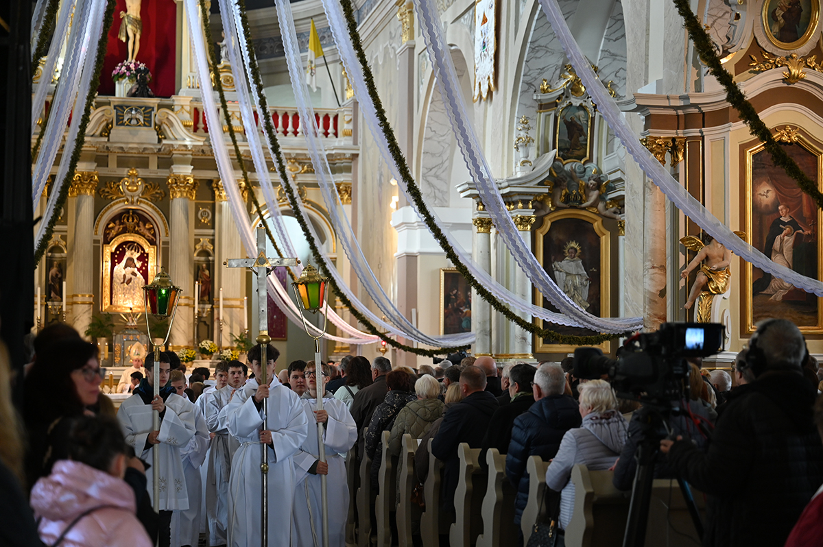 Sekmadienio rytas prasidėjo dalyviams jau pažįstama liturginių valandų malda, po kurios patarnautojai skubėjo į pusryčius. Prie stalų ilgai sėdėti neteko, nes pasistiprinę ministrantai sėdo į autobusą ir paskui JE vyskupą Algirdą Jurevičių išvažiavo į Sutuoktinių šventę Žemaičių Kalvarijoje. Ministrantų savaitgalio dalyviai įžengė į Švč. Mergelės Marijos Apsilankymo bazilika ilga procesija, kuri driekėsi beveik per visą centrinę navą. Vyko iškilmingos Šv. Mišios, kurių metu atvykę sutuoktiniai galėjo atnaujinti santuokinius pažadus. Mišių liturgiją tiesiogiai stebėti galėjo ir LRT žiūrovai, tad mūsų vyskupijos ministrantus, kurie taip drausmingai dalyvavo Mišiose, pamatė ne tik iš įvairių Lietuvos kampelių atvykusios šeimos, bet ir tūkstančiai tų, kurie liko namuose!