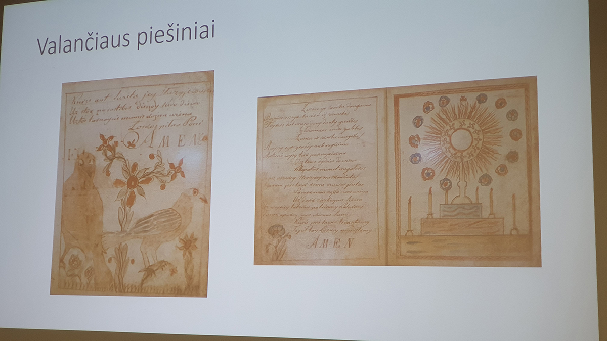 Bibliotekininkė Rita Vaitkienė pažvelgė į vyskupą M. Valančių kaip į giesmių ir liaudies dainų saugotoją. Pranešime „Lietuvių liaudies dainos – kiekvienam ir tautai“ prelegentė pristatė iki vyskupo M. Valančiaus buvusius lietuvių liaudies dainų bei giesmių rinkinius ir plačiau nagrinėjo vyskupo indėlį į lietuvių liaudies, kaip dainuojančios tautos, įvaizdžio kūrimą. Pristatyme buvo parodyta evoliucija nuo liaudies dainų užrašymo iki tarpukariu gimusios dainų šventės bei jos išpopuliarinimo mūsų laikais. Folkloro ansamblio „Šokupis“ atlikta liaudies daina pagyvino mokslinių inspiracijų prisodrintą nuotaiką.