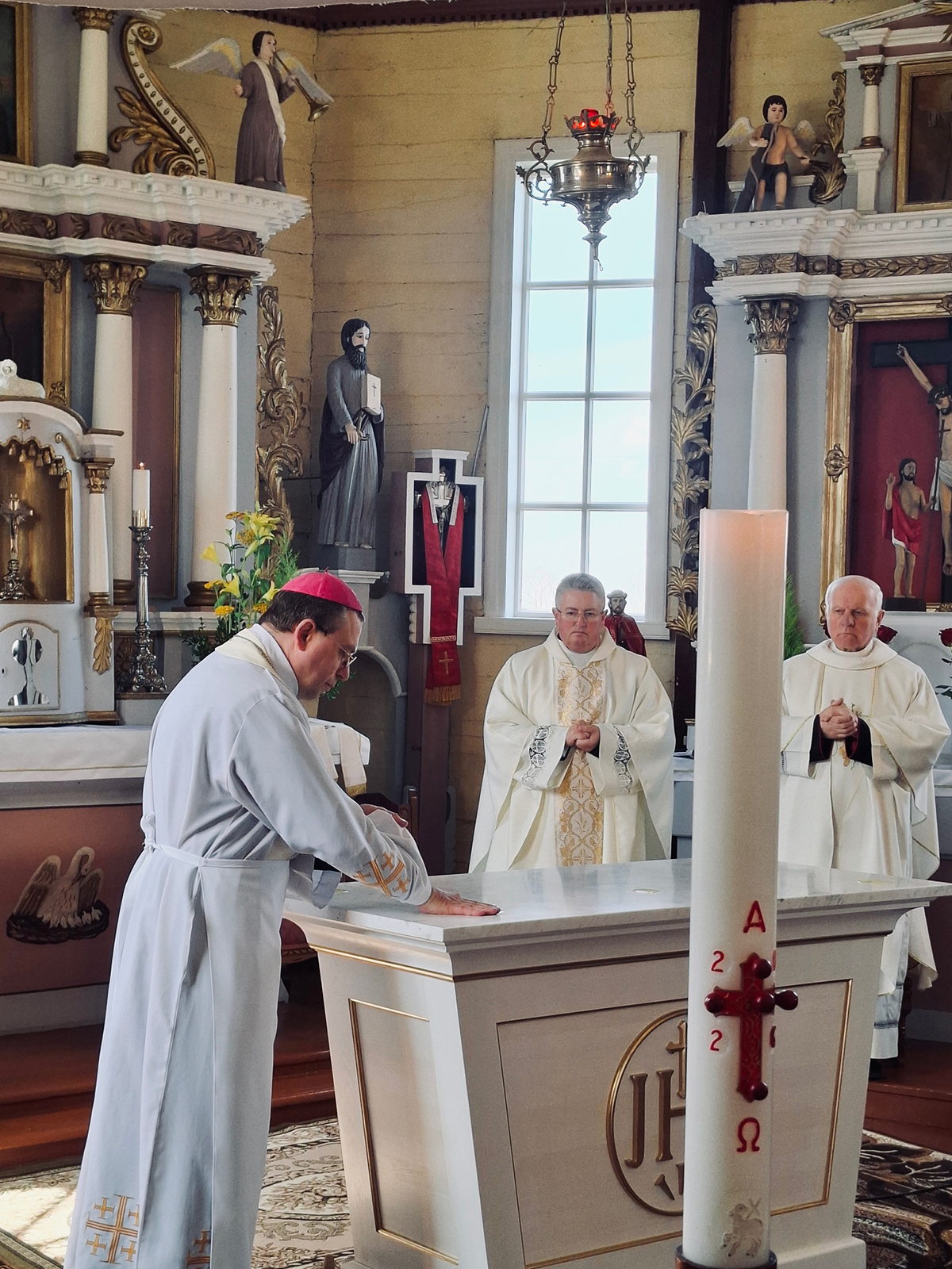 Po homilijos buvo giedamas Visų Šventųjų litanija, o vyskupas, nusiėmęs arnotą, ir apsijuosęs prijuoste, šventuoju aliejumi (chrizma) įtrynė altoriaus mensą, prieš tai išliejęs aliejų penkiuose altoriaus vietose. Tai simbolizuoja penkias Kristaus žaizdas. Po to altorius buvo smilkomas, uždengtas balta drobule ir papuoštas žvakėmis bei gėlėmis.