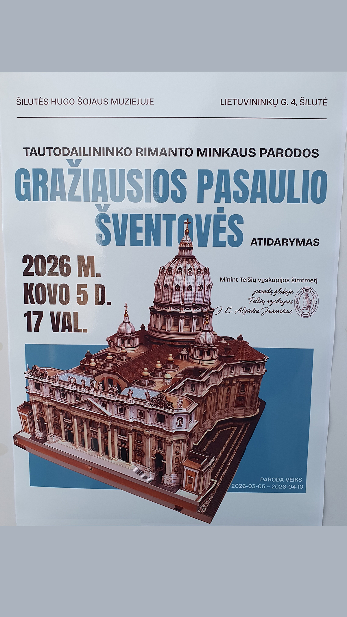 Šilutės Hugo Šojaus muziejuje 2026 m. kovo 5 d. buvo atidaryta tautodailininko Rimanto Minkaus paroda „Gražiausios pasaulio šventovės“, skirta Telšių vyskupijos Šimtmečiui paminėti. Parodos globėjas – Telšių vyskupas Algirdas Jurevičius. Renginį, kurį muzikos garsais pradėjo Šilutės meno mokyklos auklėtinės, vedė muziejaus direktorė Indrė Skablauskaitė. Parodos dalyvius apdovanojo vyskupijos Šimtmečio suvenyrais Šilutės dekanas kan. Remigijus Saunorius.