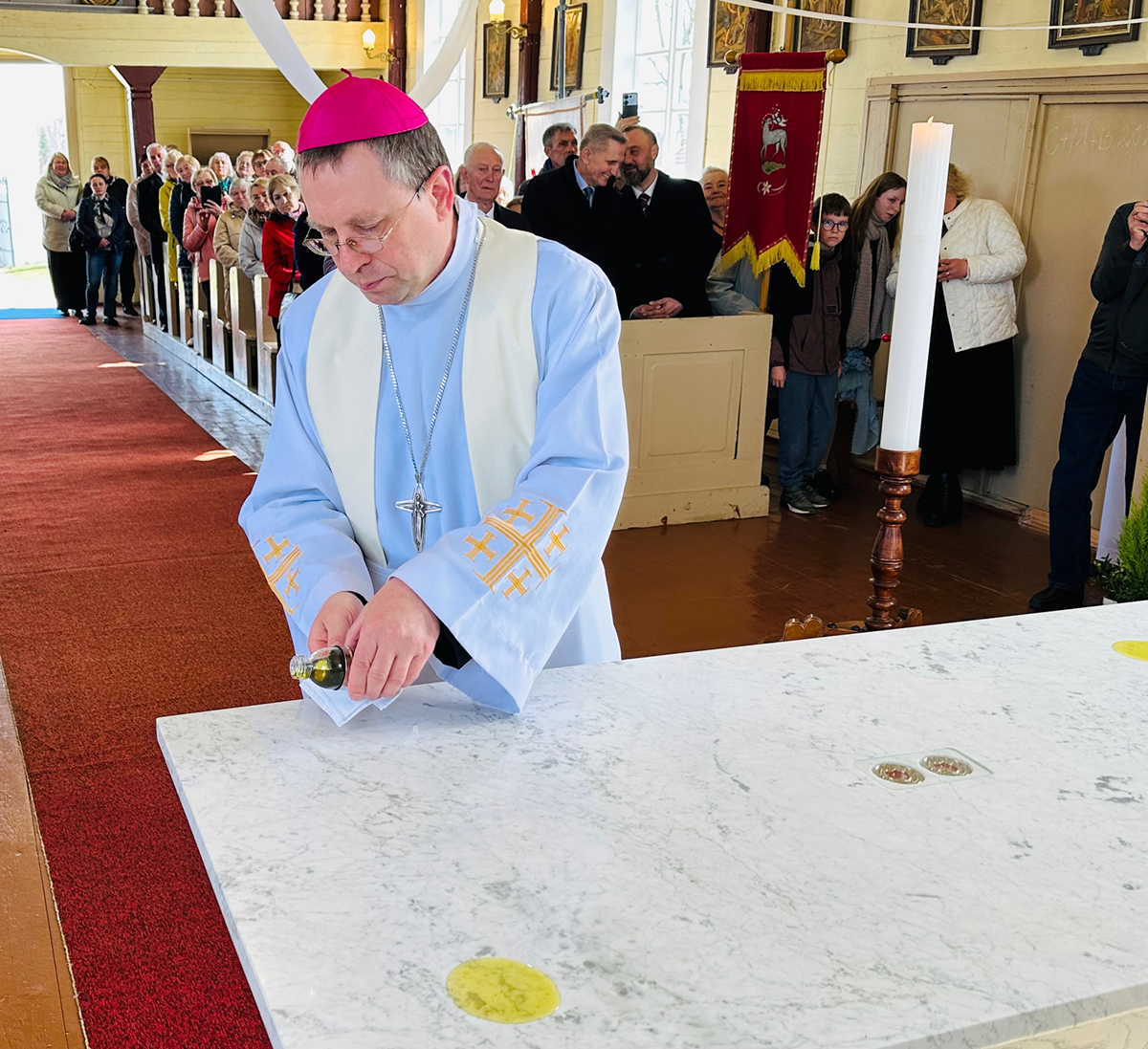 Po homilijos buvo giedamas Visų Šventųjų litanija, o vyskupas, nusiėmęs arnotą, ir apsijuosęs prijuoste, šventuoju aliejumi (chrizma) įtrynė altoriaus mensą, prieš tai išliejęs aliejų penkiuose altoriaus vietose. Tai simbolizuoja penkias Kristaus žaizdas. Po to altorius buvo smilkomas, uždengtas balta drobule ir papuoštas žvakėmis bei gėlėmis.