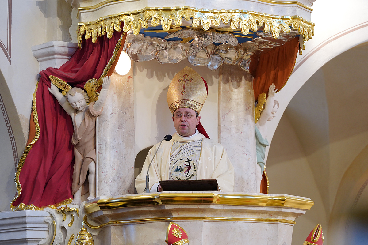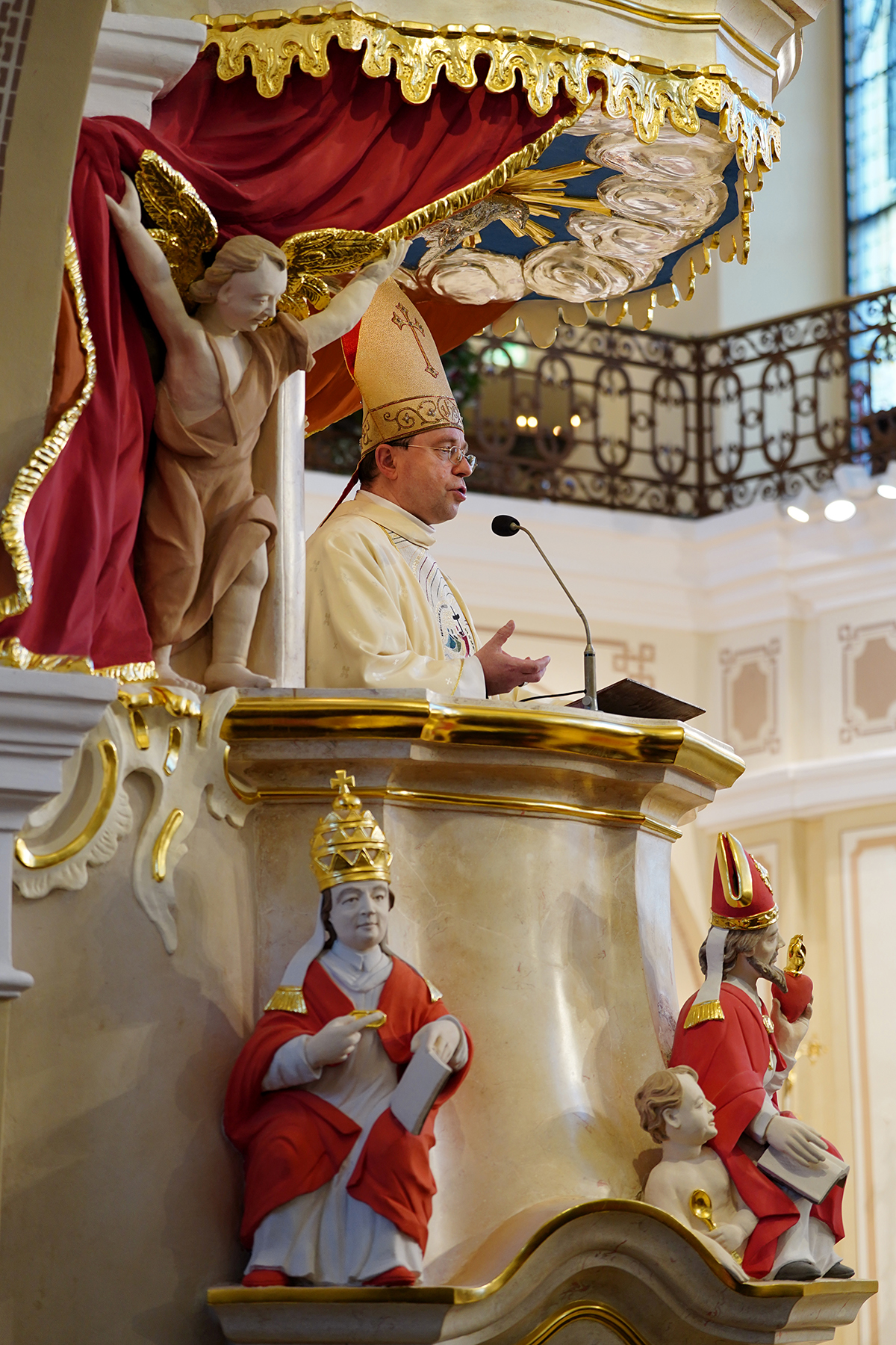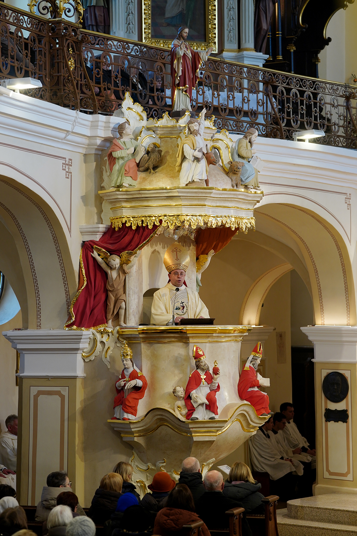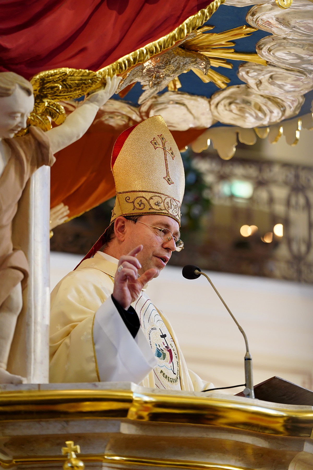 Homilijos žodžiui ganytojas lipo į istorinę trečią šimtmetį skaičiuojančią sakyklą, iš kurios skelbiamos pačios iškilmingiausios žinios. Iš ten vyskupas pristatė šv. Juozapą kaip piligrimą, kuris net naktį keliasi, ima motiną bei kūdikį ir pasitraukia į Egiptą. Tikras piligrimas visuomet ieško Dievo valios ir yra jautrus Viešpaties balsui, kalbančiam per Šventąjį Raštą ir Bažnyčios mokymą.